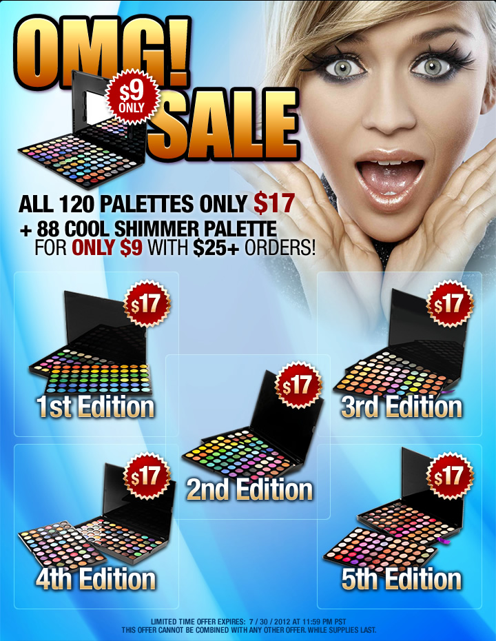 Good morning! I love unexpected pleasantries like waking up and having a email about a HUGE FREAKING SALE at BH Cosmetics!!! If you haven’t heard of BH Cosmetics they are used by tons of pro’s who travel a lot and need a (very) wide range of colors to work with. I dont know how they do it but their eyeshadows are really great and pretty well pigmented and they are CHEAP CHEAP CHEAP. They do huge palettes of not only eyeshadows but concealers, blushes, lipsticks/glosses and are usually under $20. I have 5 palettes from them that I use fairly often. Well they are having a massive sale and you must check it out if you’re in the market for some new shades. The quality isn’t as great as MAC, NARS, YSL, etc., but for 88 or 120 eyeshadows in one palette for the under the price of one NARS Shadow it’s worth the purchase!